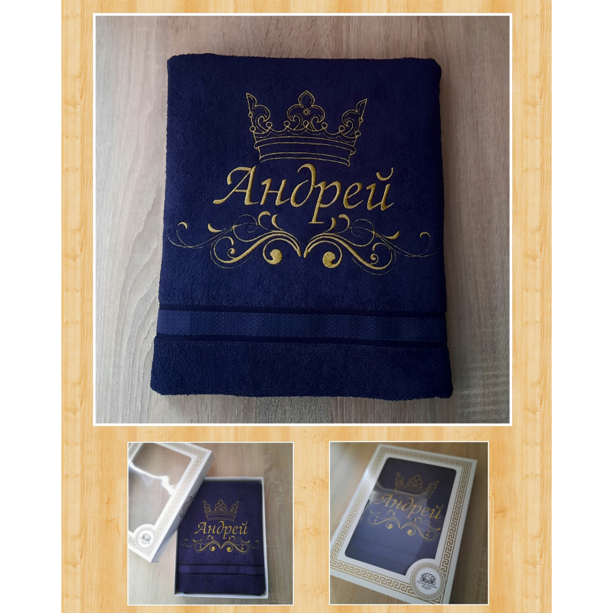 Іменний банний рушник бавовна 70х140см Андрій синій з золотом
